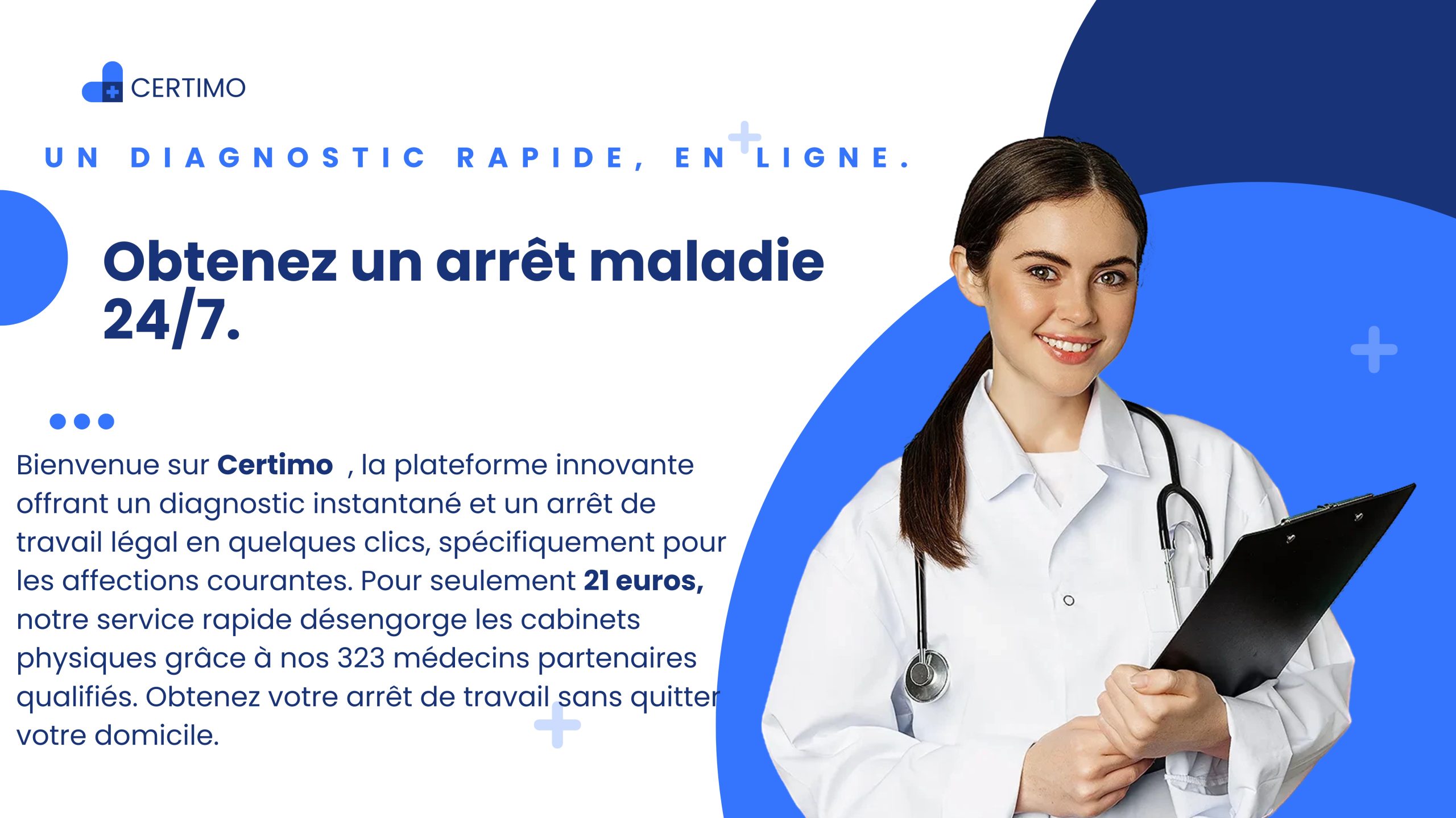 Bienvenue sur Certimo, la plateforme innovante qui simplifie vos démarches médicales. En quelques clics, obtenez un diagnostic rapide et un arrêt de travail légal pour les affections courantes.